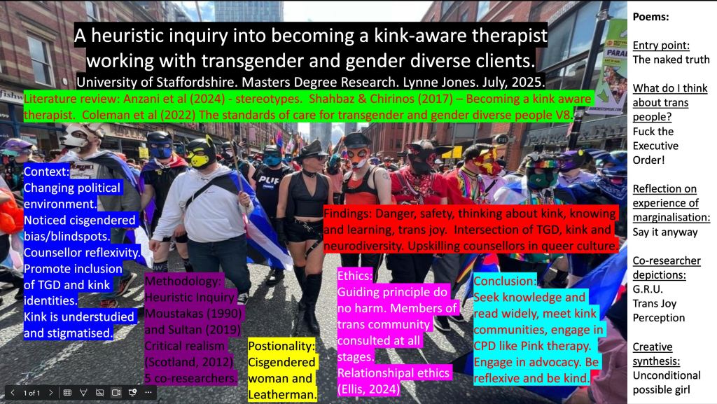 I am proud to introduce – a heuristic inquiry into becoming a kink-aware therapist working with transgender and gender-diverse clients. If you’d like to explore it further see the abstract or ask for the full dissertation.
